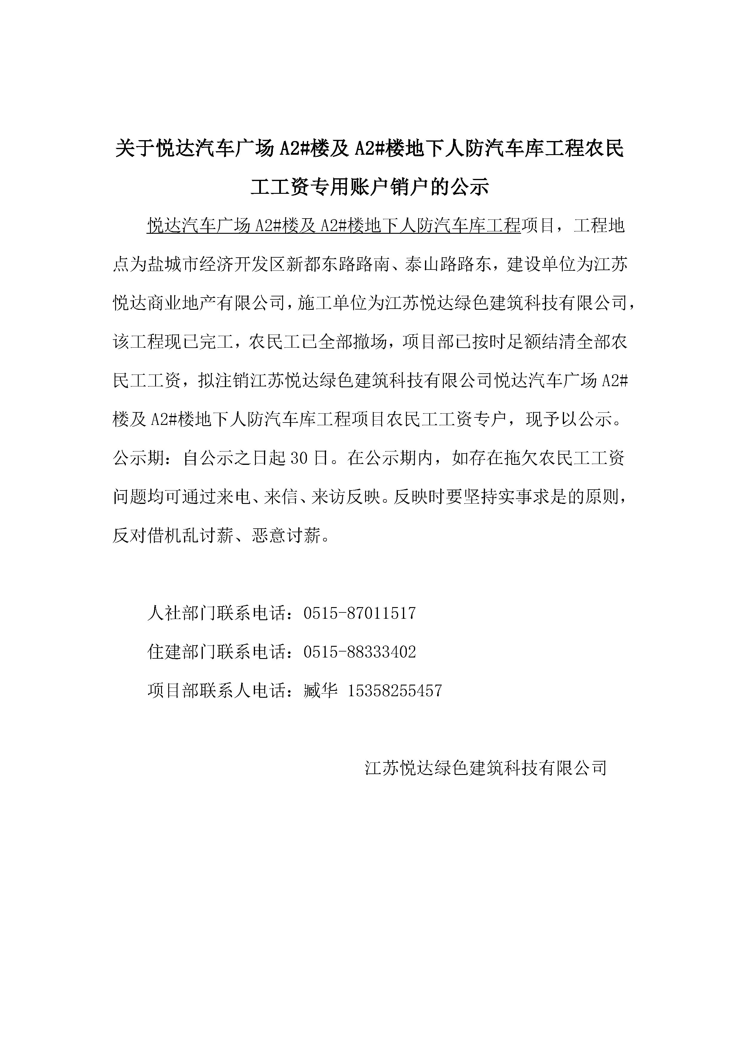 關(guān)于悅達(dá)汽車廣場A2#樓及A2#樓地下人防汽車庫工程農(nóng)民工工資專用賬戶銷戶的公示