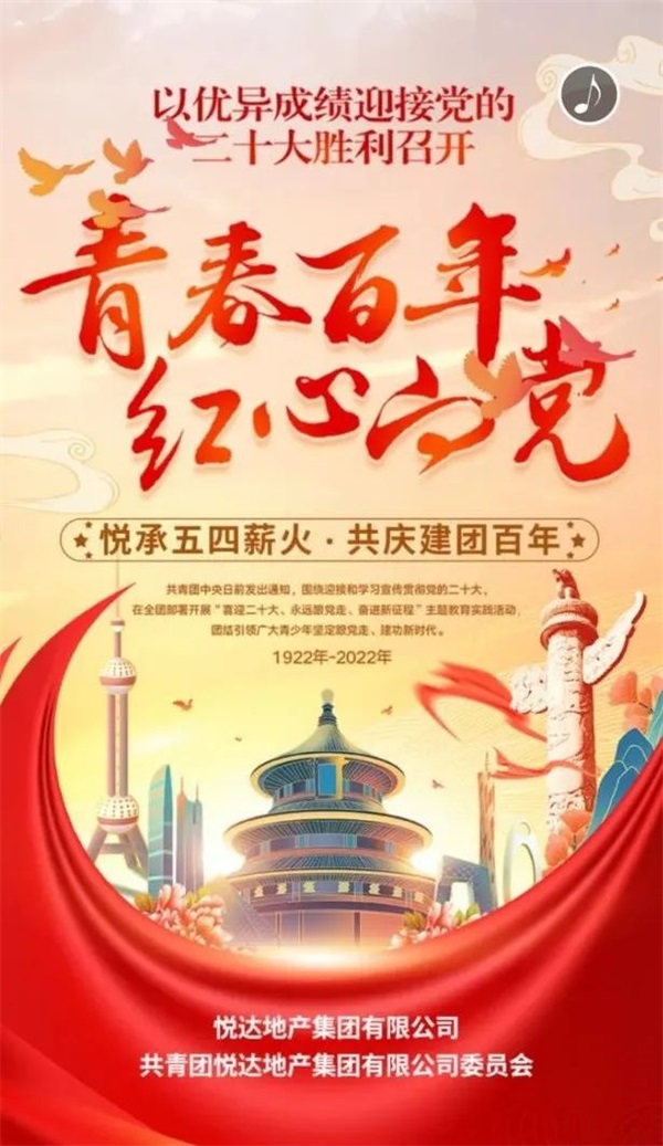 青年興則國家興,青年強(qiáng)則國家強(qiáng)。在中國共產(chǎn)主義青年團(tuán)成立100周年之際,悅達(dá)地產(chǎn)集團(tuán)有限公司團(tuán)委組織開展“悅承五四薪火•共慶建團(tuán)百年”主題系列活動,帶領(lǐng)公司全體青年員工高舉團(tuán)旗跟黨走,奮力投身抗疫一線,用青年誓言感恩時(shí)代,慶祝共青團(tuán)建團(tuán)100周年,滿懷信心迎接黨的二十大勝利召開。