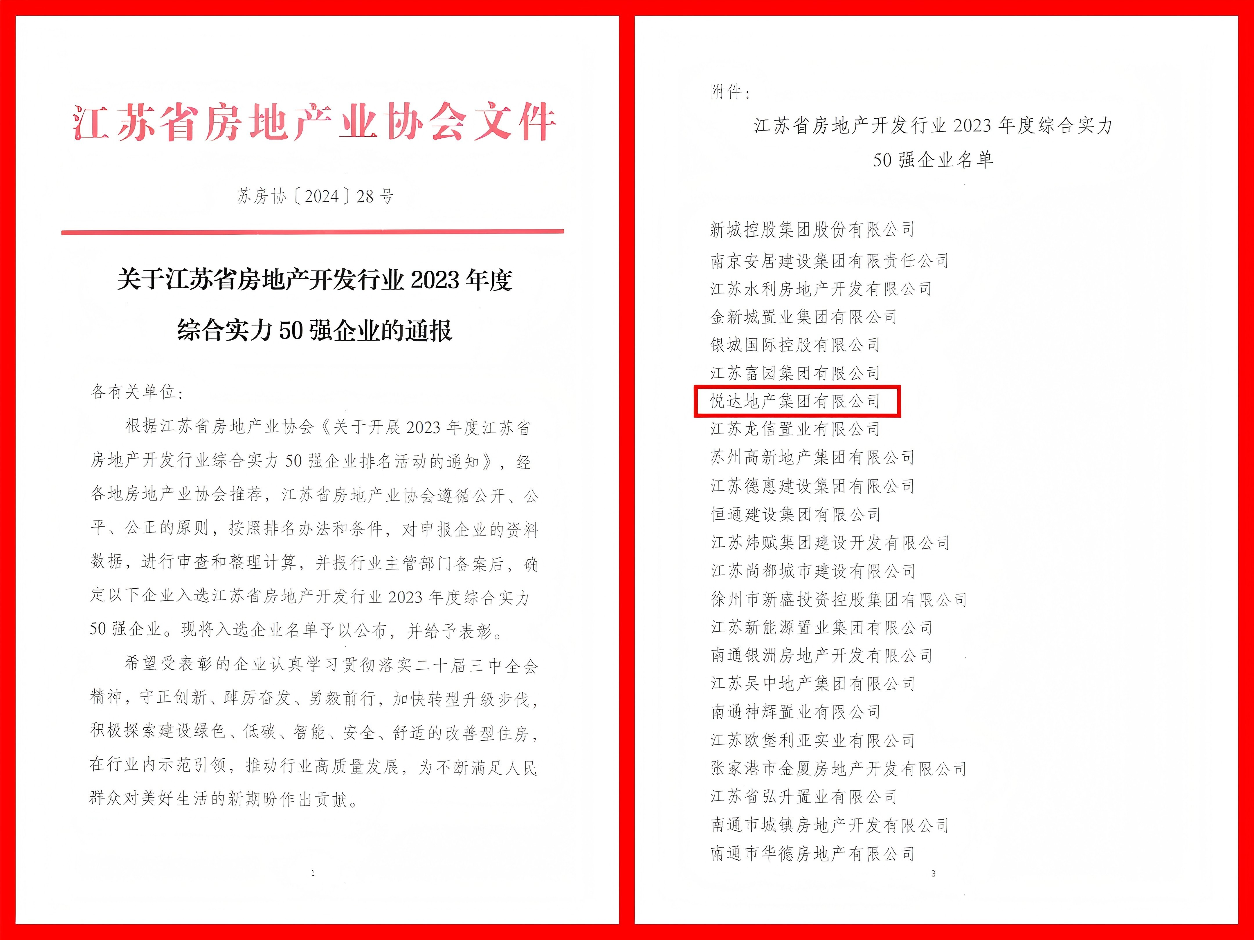 12月6日,以“新質賦能好房子”為主題的2024江蘇省房地產開發行業高峰研討會在無錫召開。會上,江蘇省房地產業協會發布了《江蘇省房地產開發行業2023年度綜合實力50強企業名單》,悅達地產榮列第7位、繼續穩居全省前10強,是鹽城市唯一進入前10強的企業,充分彰顯悅達地產長期穩健的綜合開發實力。
