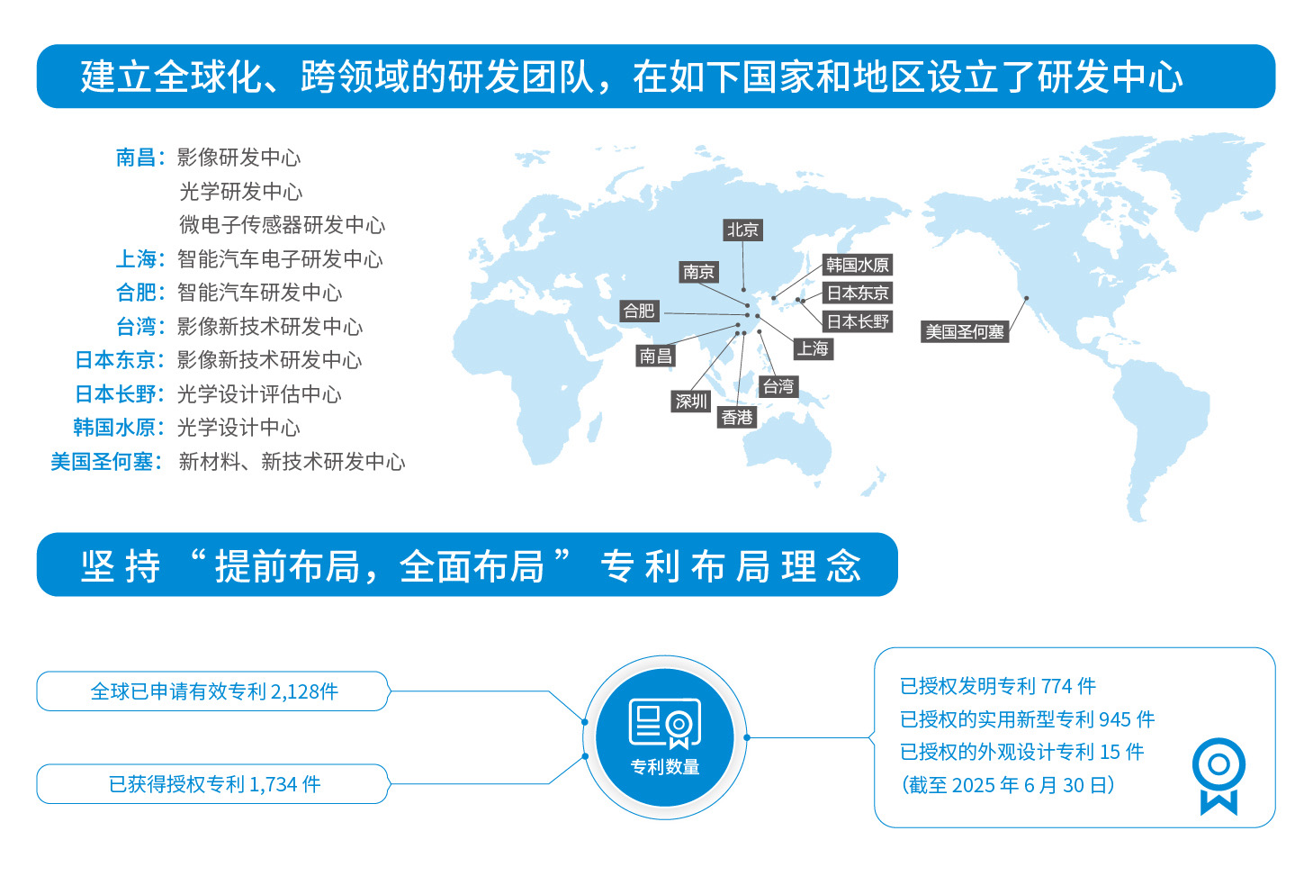 “提前布局,全面布局”是歐菲光專利的布局理念,布局領(lǐng)域涉及智能手機(jī)、智能汽車和新領(lǐng)域等。 截至 2025 年 6 月 30 日,公司在全球已申請(qǐng)有效專利 2,128件,已獲得授權(quán)專利 1,734 件。其中,授權(quán)發(fā)明專利 774 件,已授權(quán)的實(shí)用新型專利 945 件,已授權(quán)的外觀設(shè)計(jì)專利 15 件。